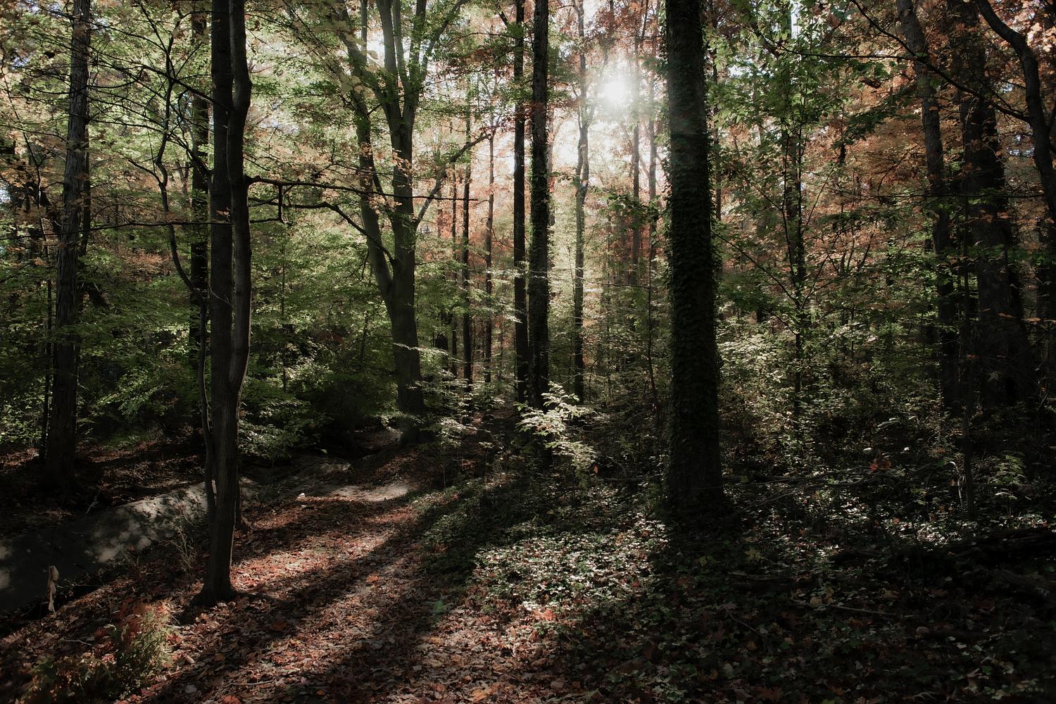 August 30, 2023, woods in Northern Va. Soon we will witness the beginnings of Autumn... greens turning to yellow, red and burnt orange, the sun will be lower in the sky casting long shadows, but the sky will still be blue! The leaves will then make their way to pave the ground and fertilize the soil for next Spring! Hope you enjoy every day!